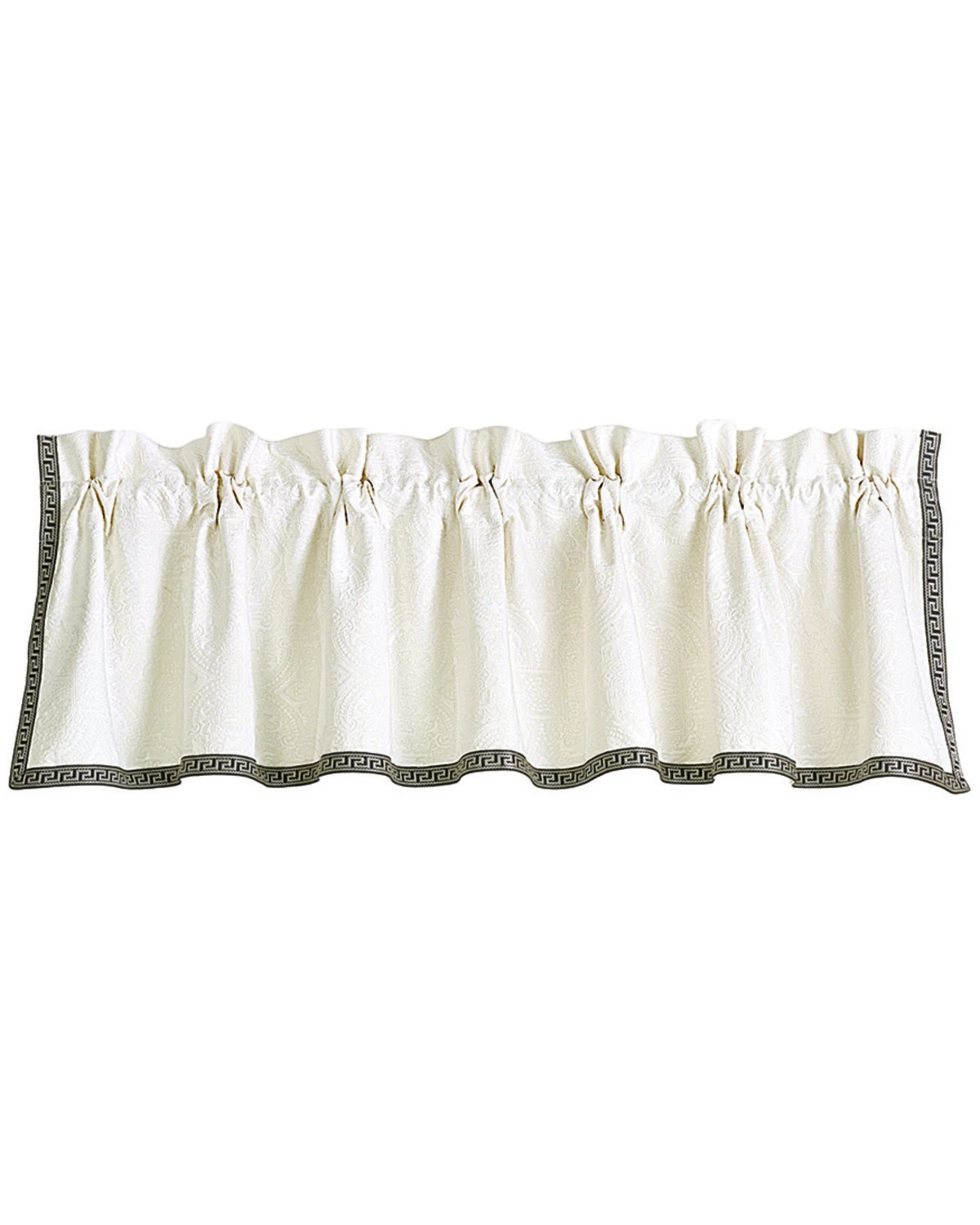This creation comes from none other than HiEnd Accents, a company that specializes in only the best western and home decor. With its vintage white matelasse fabric with black Greek key trim and rod pocket design, this valance is the perfect finishing touch to your bedroom. It is a part of the Augusta bedding collection but can stand alone as a single piece.