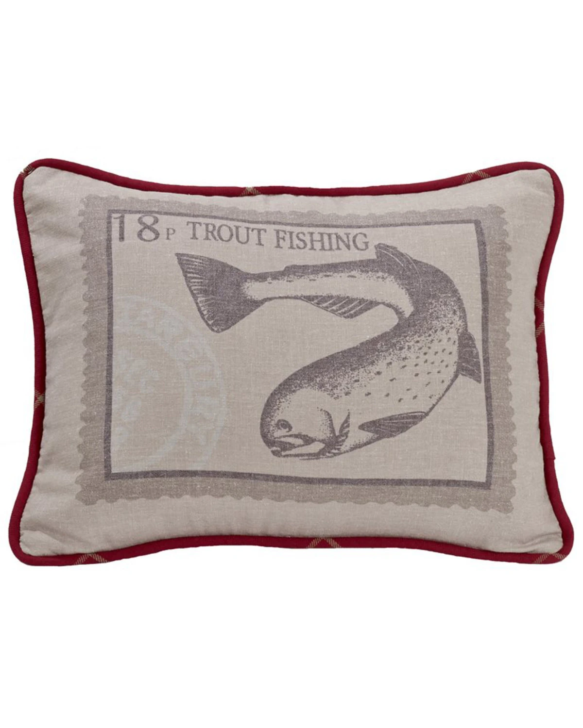 Accent your western-style bedroom with this South Haven trout throw pillow from HiEnd Accents. Measures 16″ x 21″ and features a screenprint trout on front with red trim.